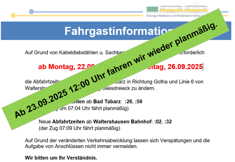 © Thüringer Waldbahn und Straßenbahn Gotha GmbH | Alle Rechte vorbehalten | Datenschutz | Impressum | Admin | Alle Angaben auf diesen Seiten erfolgen ohne Gewähr.